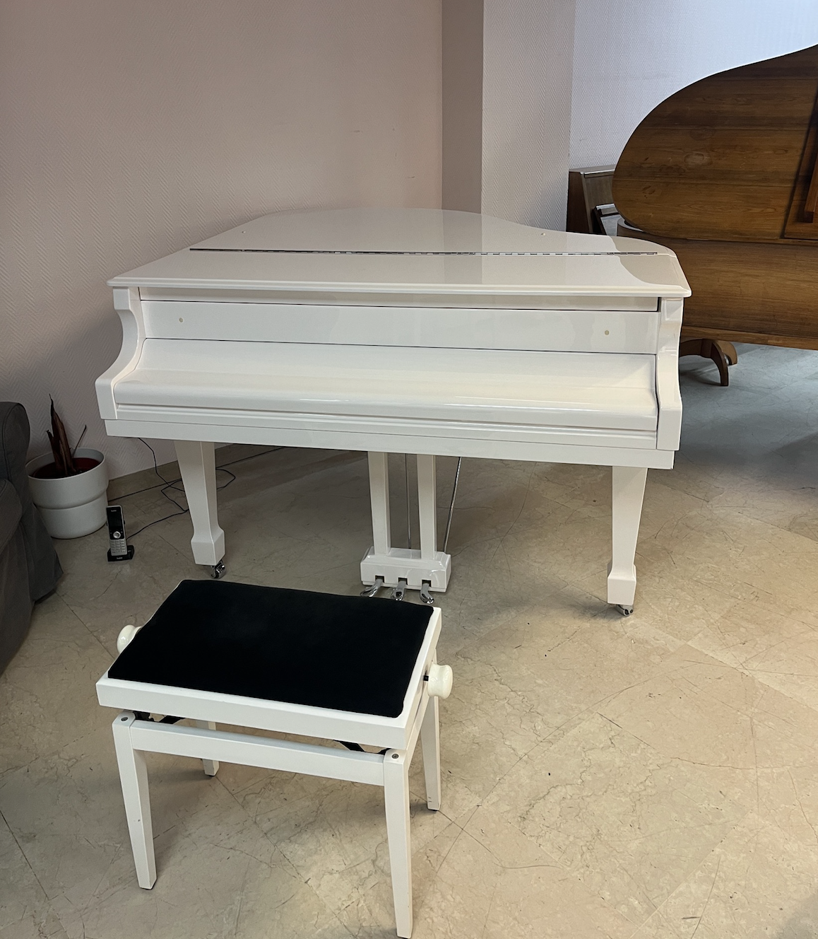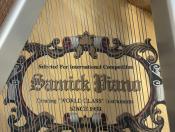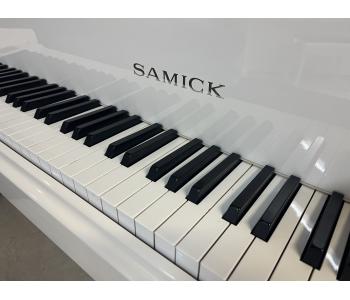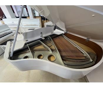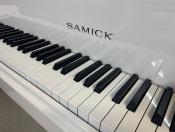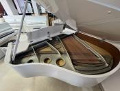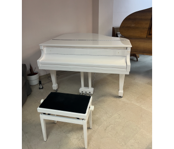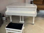 Ravissant piano à queue compact, SAMICK, blanc perle brillant avec cadre métallique "silver", et acastillage chromé.