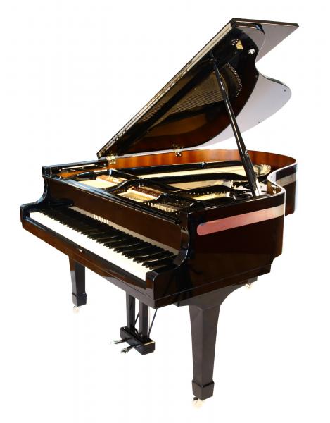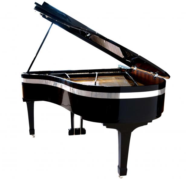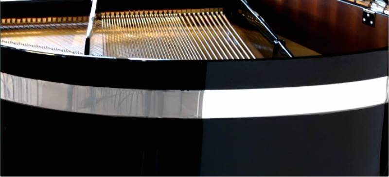 Ce piano, d’un noir laqué profond réhaussé d’un large liseret chromé courant le long de sa ceinture, est d’une modernité et d’une élégance qui le démarquent des gammes traditionnelles des fabricants classiques.